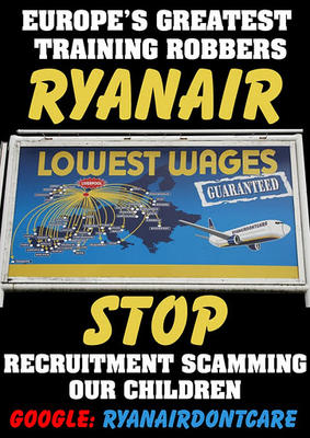 Job creation is a lie,Termination of Probationary cabin crew will run into thousands as long as Ryanair can recruit young people to be scammed.Ryanairdontcare Campaign will continue to target cabin crew recruitment...Tax will go to Ireland from probationary cabin crew who work in Europe.Time for Europe Governments to wake up....UK Cabin crew tax will not go to Ireland as the UK Government will not allow this to happen....Ryanair use Cabin Crews employment tax .Ryanair place this tax in a high interest account with the Bank of Ireland who are a big Ryanair shareholder and have worked with Ryanair to scam Probationary Cabin Crew..Bank of Ireland started to give training loans out to these students to pay for Ryanair cabin crew training in one go...Then it was passed to the Allied Irish Bank after i contacted the Bank Of Ireland.